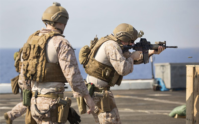منطقة المسؤولية، بما في ذلك سفينة الهجوم البرمائي تريبولي التي تحمل حوالي 2500 من مشاة البحرية، حيث اكتمل تجمع أكثر من 3500 فرد من القوات الأمريكية. هذه السفينة الحديثة من فئة أمريكا، القادمة من قاعدة يوكوسوكا في اليابان، لا تأتي فقط بحاملات طائرات إف-35